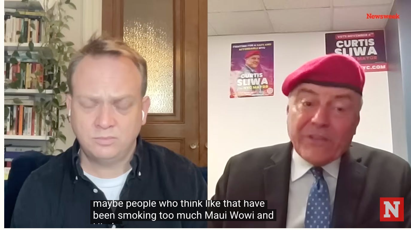 Curtis Sliwa is like when you have an uncle you think is really funny, and when you finally introduce them to a friend, you say "Aren't they hilarious?" and your friend is like "No, they are just really racist." and it's like "Huh, never noticed that before."